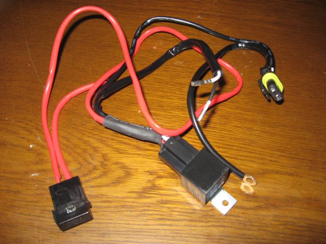 説明書らしい説明書が入っていませんが、リレーハーネスです。赤の丸端子がバッテリー+・黒の丸端子がボディアース・ギボシのついた白/黒はそれぞれロービームのスイッチのケーブルにでも割り込むのとアースでしょうか。