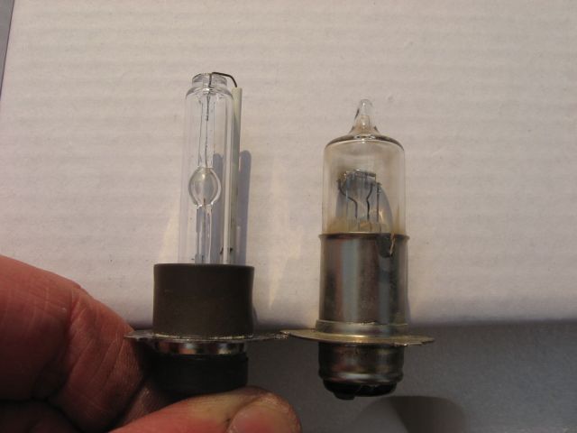 もう一つ ハロゲンのほうはダブルフィラメントになっていてこの写真では判りにくいのですが台座から同じ距離で平行に並んでいます。Lo側点灯の時には反射鏡の下半分にはフィラメントの影が出来ていてHi側には光が回らないようになっているのだと思います。